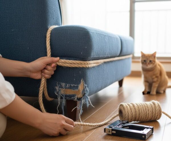 ボロボロになった布地の上から麻縄を巻くことで、見た目の悪さを隠せるだけでなく、その部分が猫にとって「正規の爪とぎスポット」に生まれ変わります。猫は麻の感触が大好きなので、喜んでそこで研いでくれるようになります。